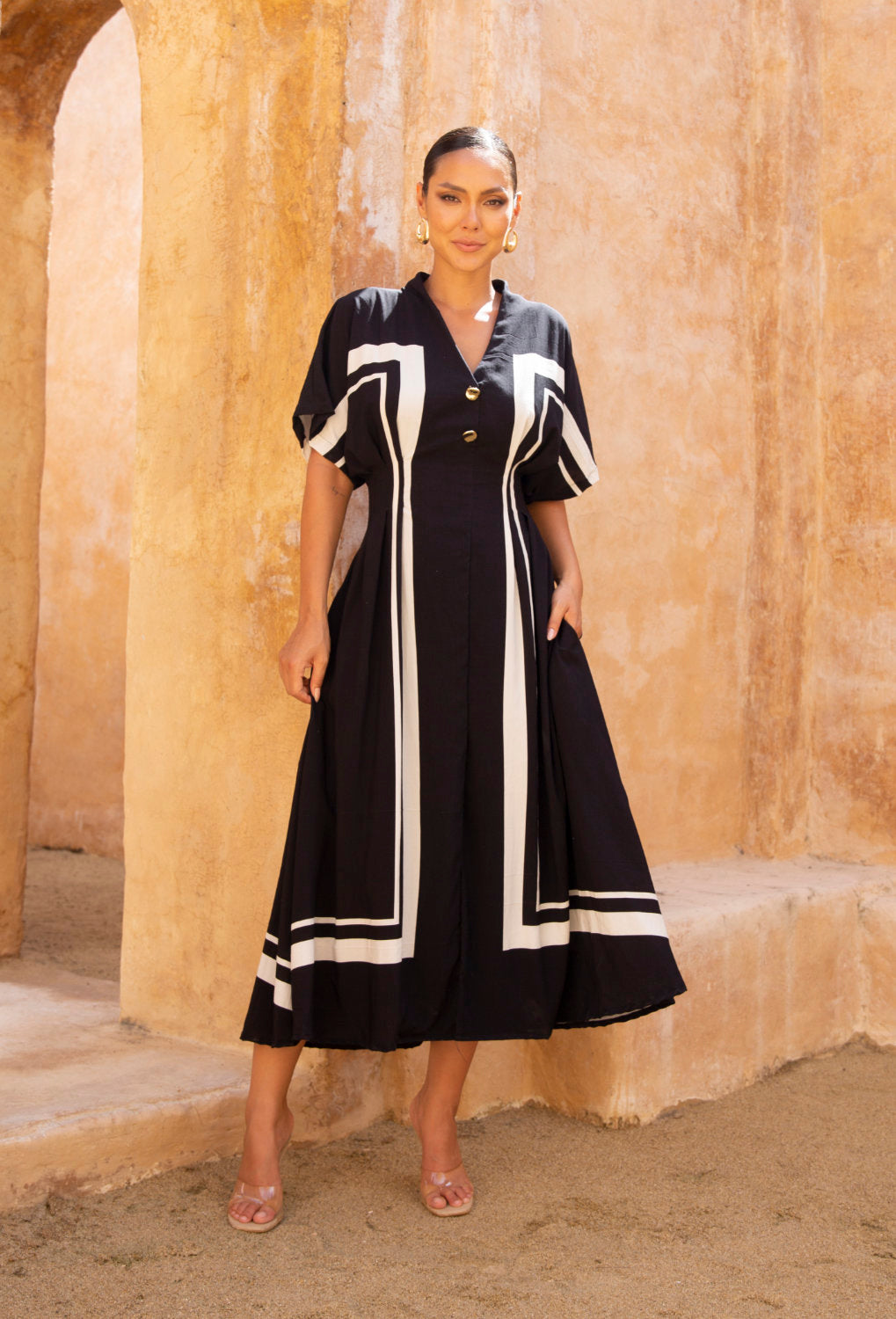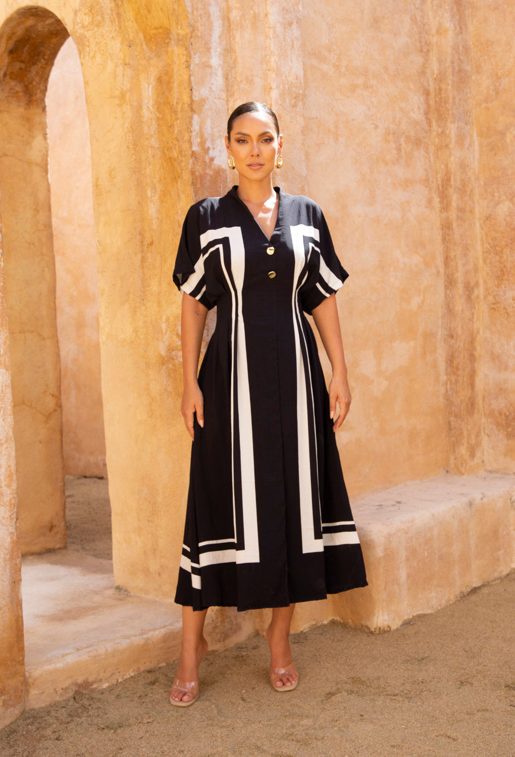 - Soft V-neckline with statement gold button detailing