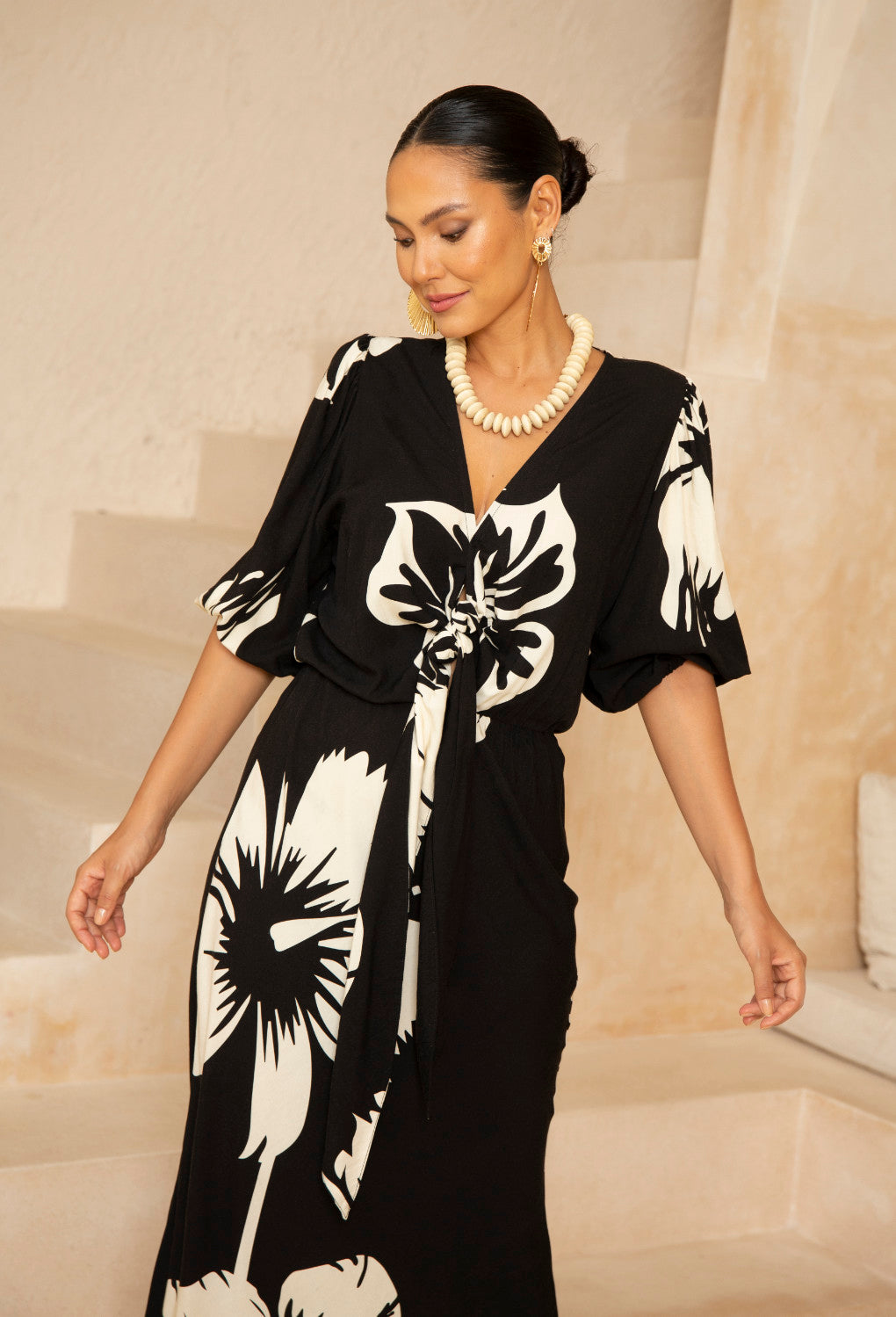- Flattering V-neckline with Front Tie