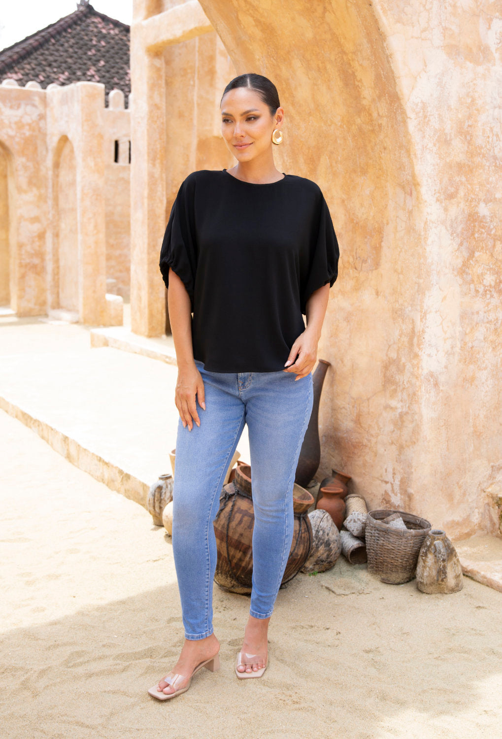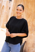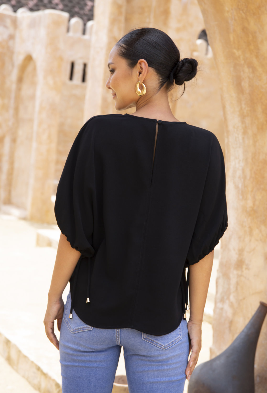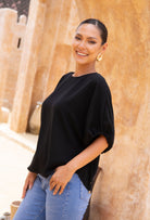 - Short dolman-style sleeves for comfort and arm coverage
